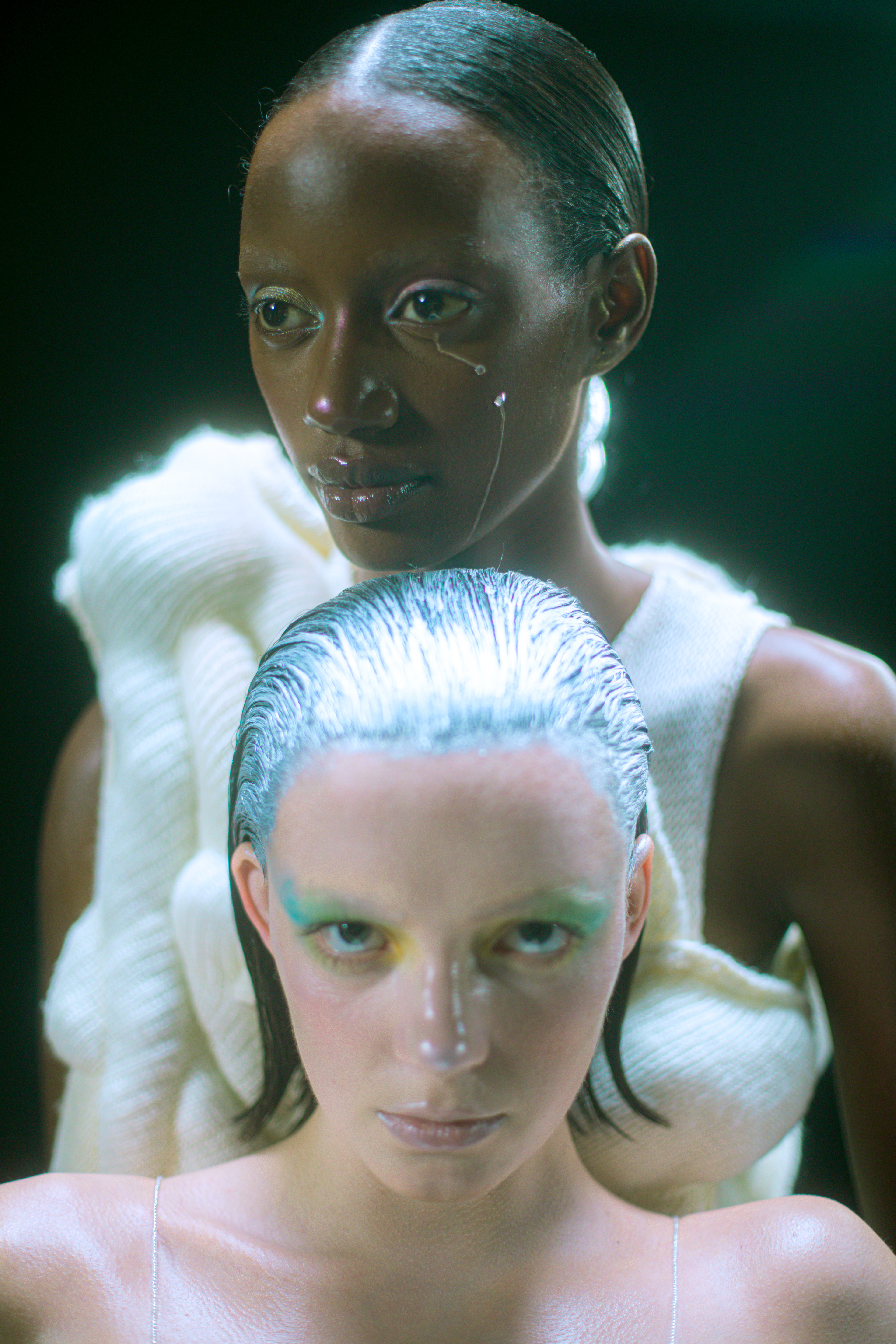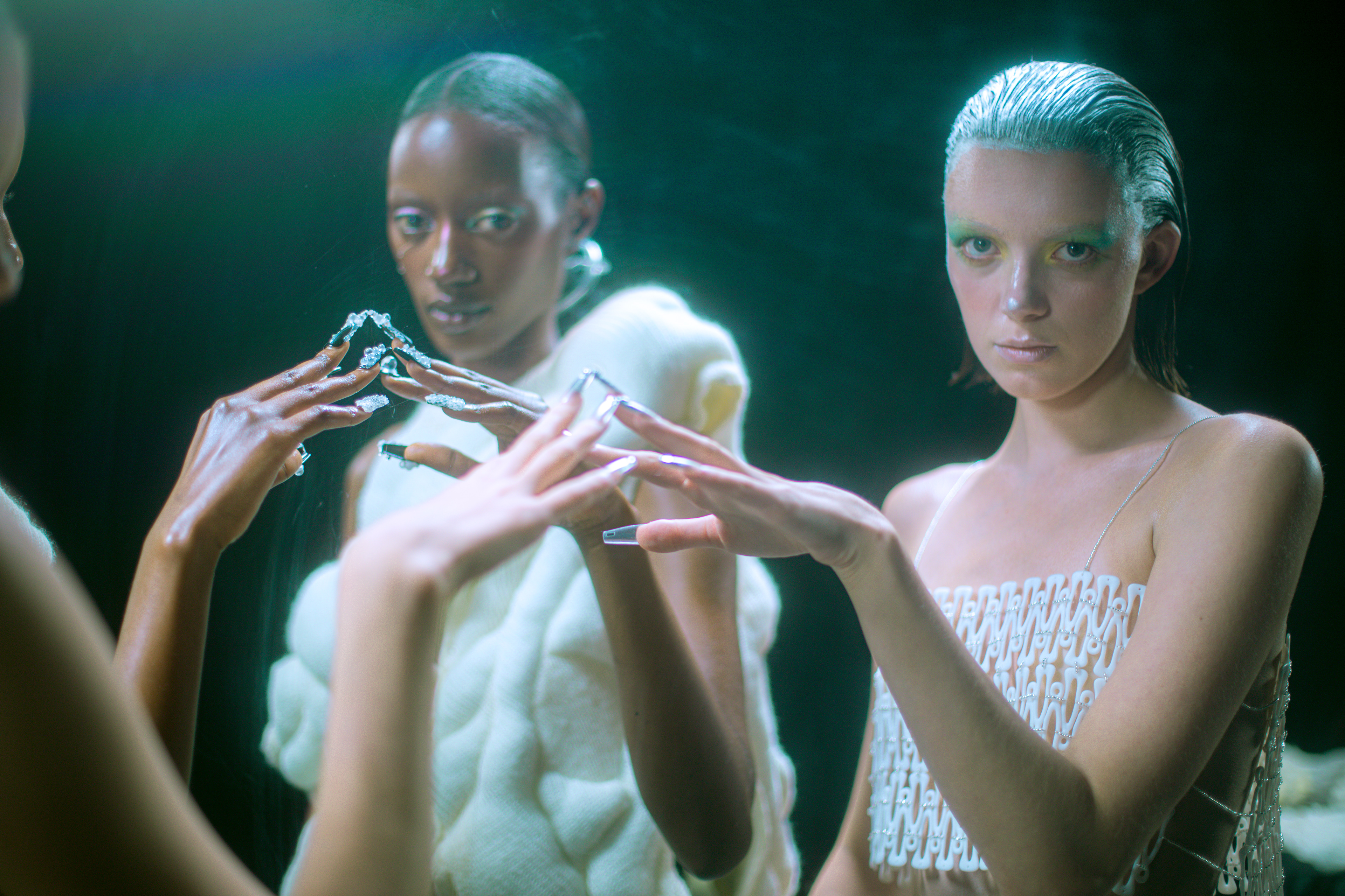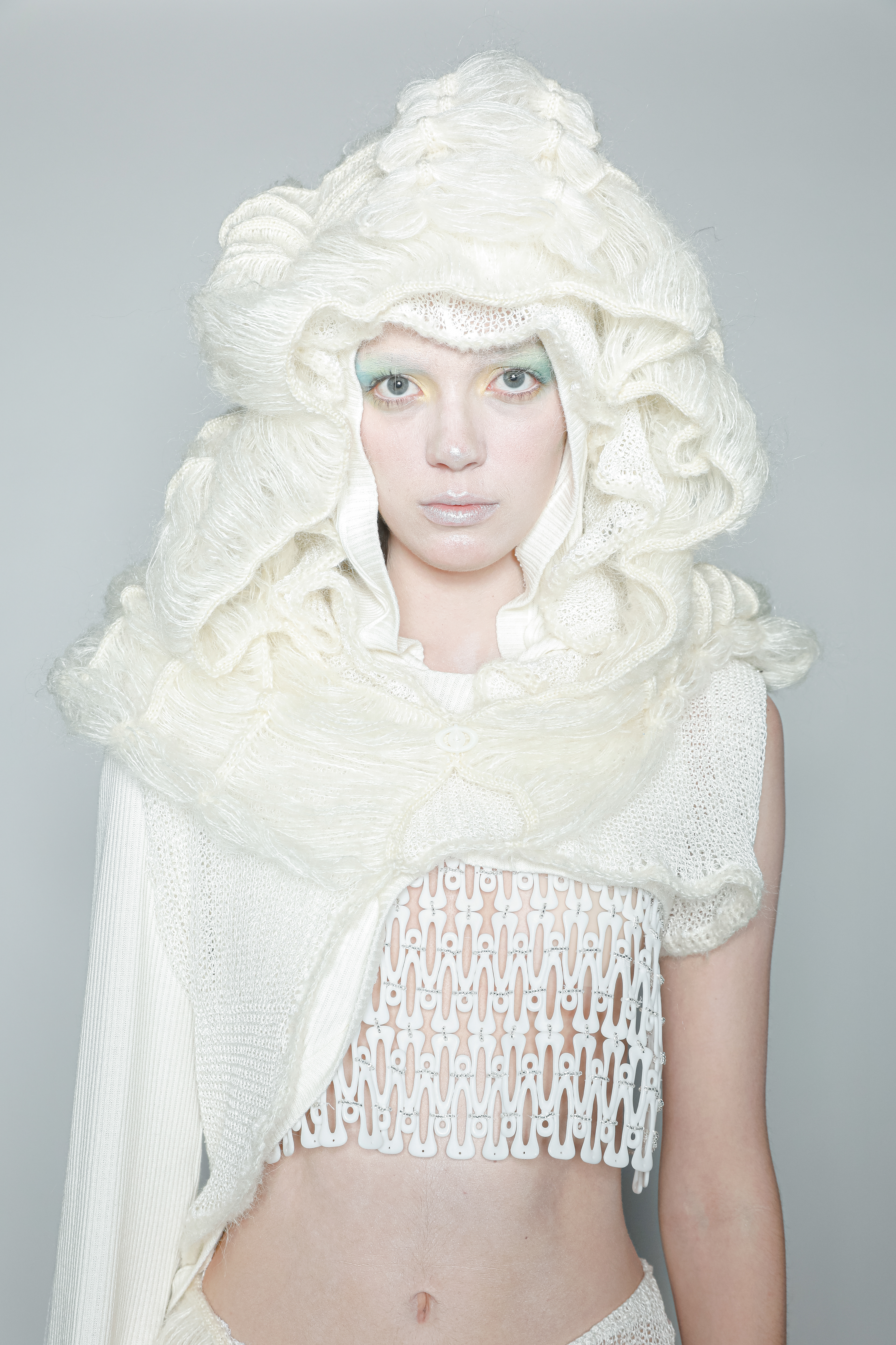 Materiality plays an essential role and is seen through the use of plant foam material, bio textiles, and dead stock yarns. Yunyi integrates advanced technology and unconventional materials with traditional techniques such as combining crochet work with 3D printing structures. She sees her work as a comforting and immersive tactile experience with a visual tone of futuristic couture.